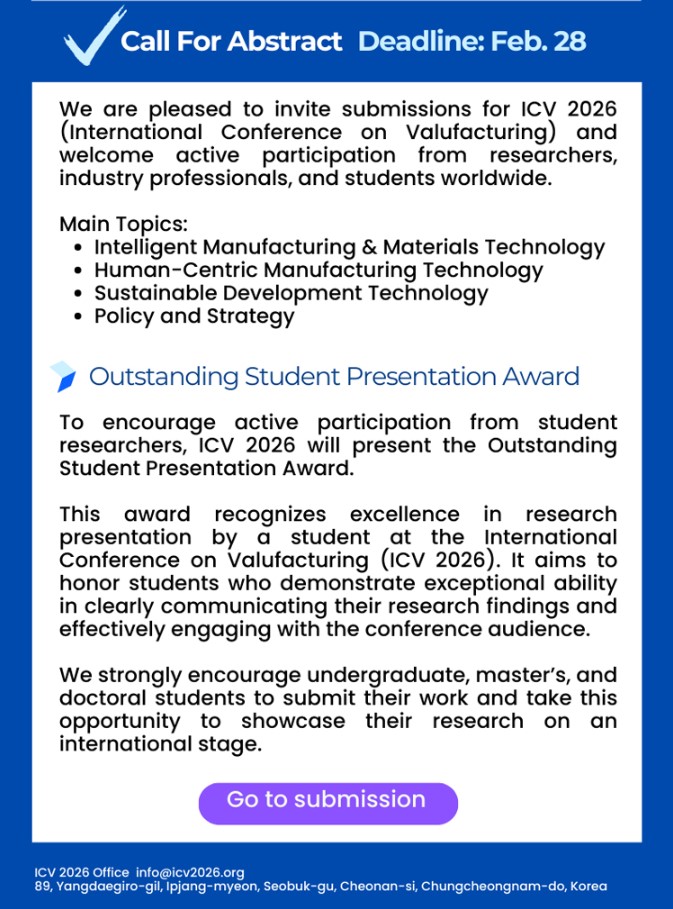 | [한국생산기술연구원] 밸류팩처링 국제학술대회(ICV2026) 개최 안내 |