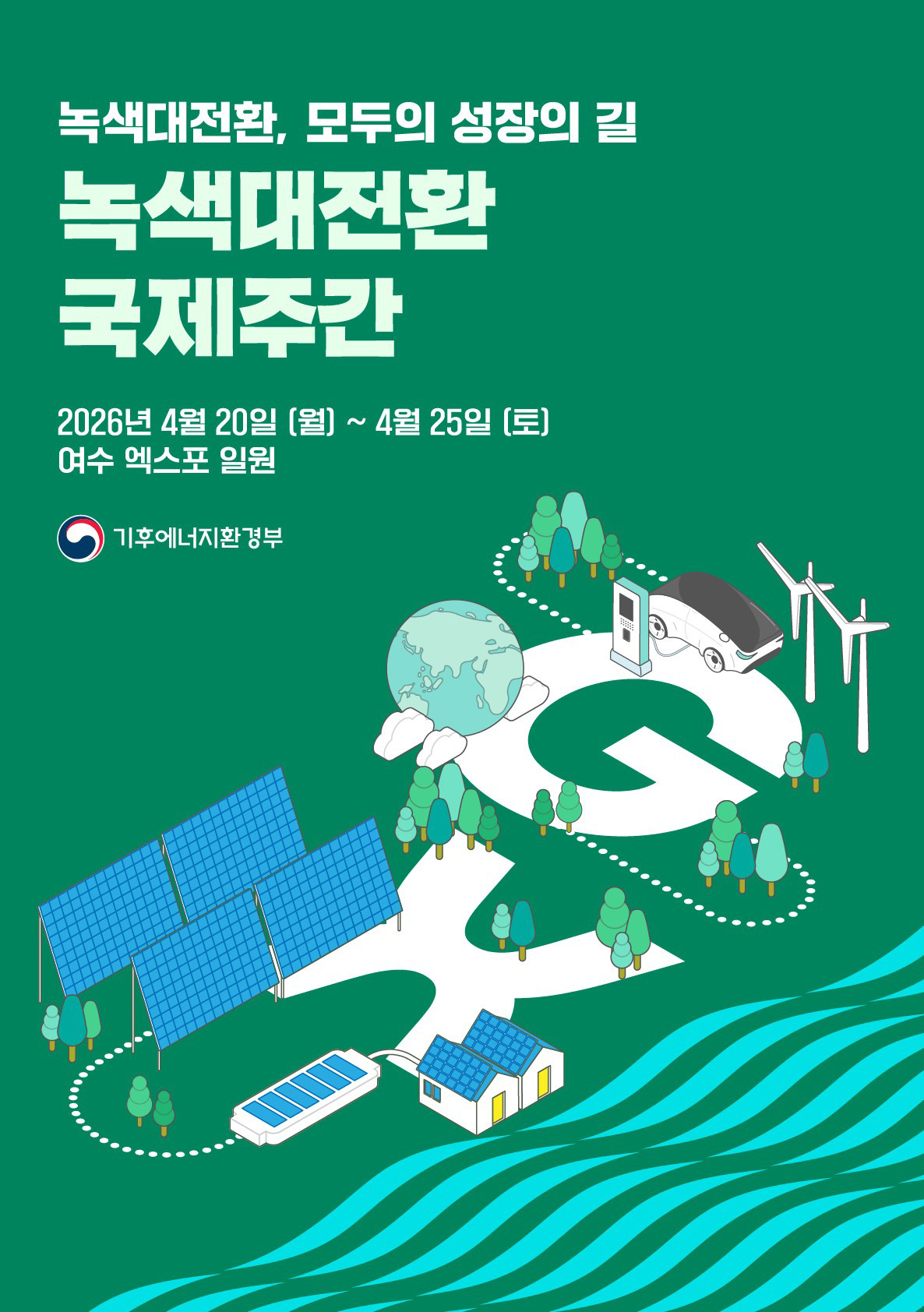 - 행사명 : 녹색대전환 국제주간 - 기간 : 2026년 4월 20일(월)~25일(토) - 주제 : 녹색대전환, 모두의 성장의 길 - 장소 : 전라남도 여수시 여수엑스포 일원 - 참가 : 누구나 참가 가능(홈페이지 사전등록) - 주최 : 기후에너지환경부 - 공식언어 : 한국어, 영어 - 홈페이지 : https://gxweek.kr/default.cm |